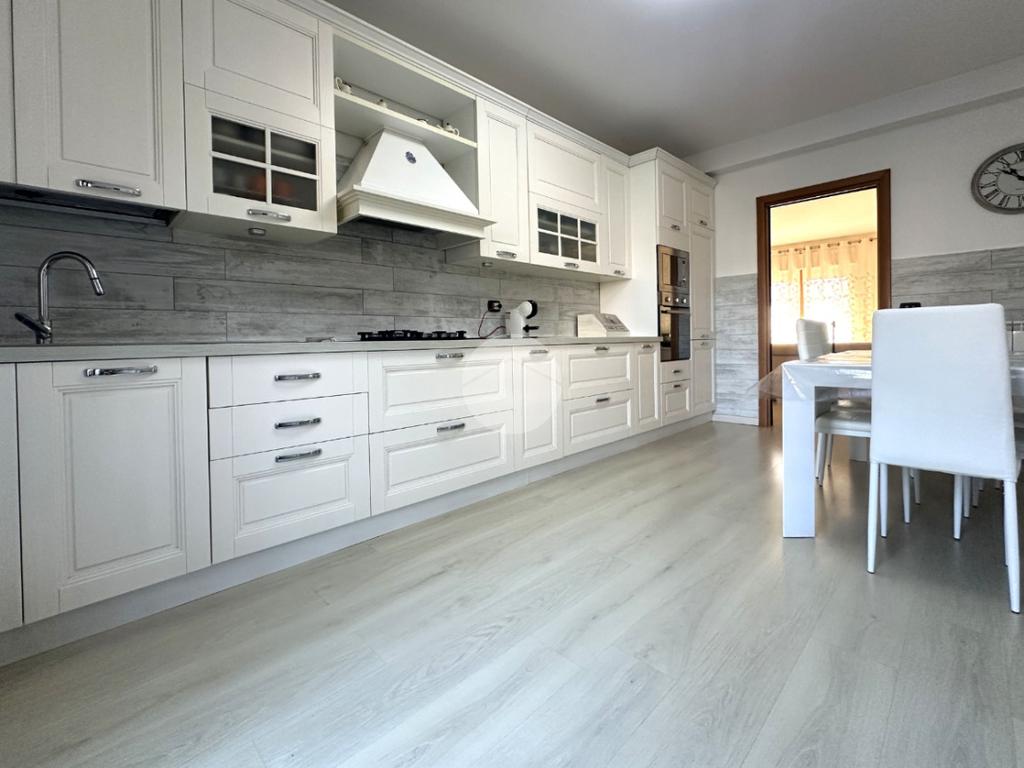 La cucina è spaziosa e moderna, progettata per essere funzionale e confortevole. Da qui si ha accesso al secondo balcone che conduce alla corte esterna.