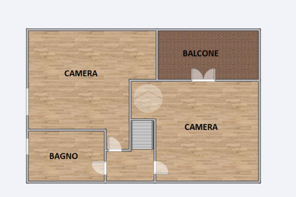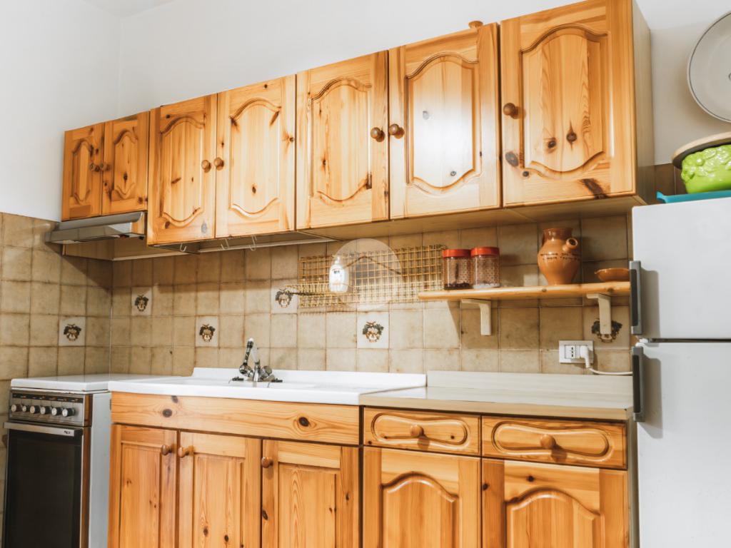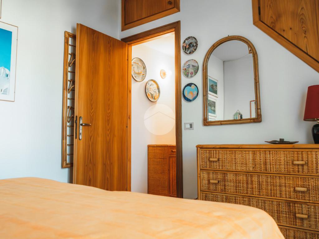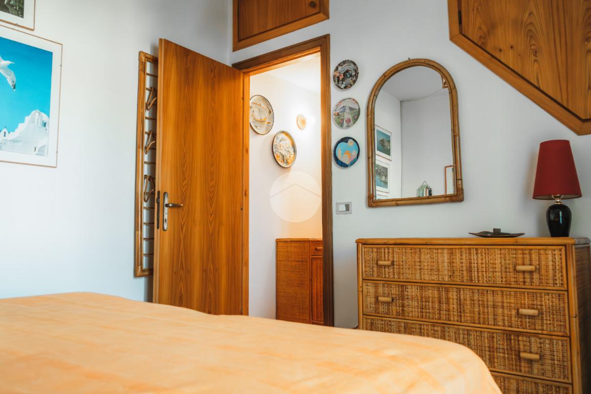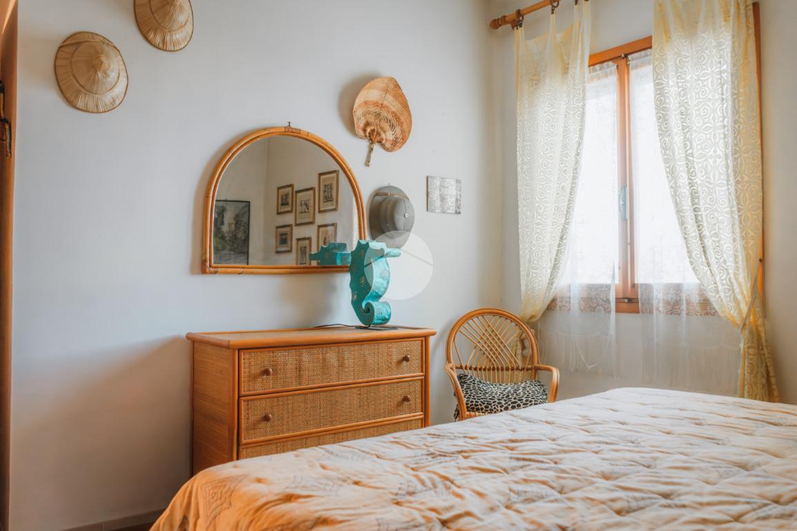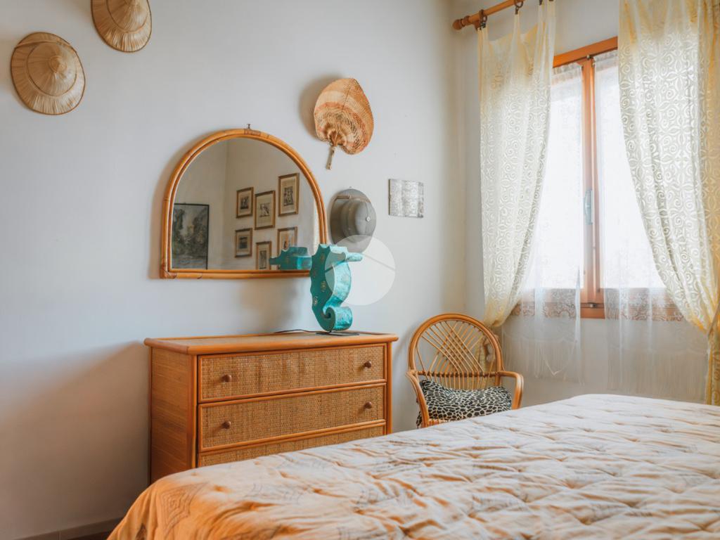 La scala in legno interna conduce al piano primo in cui è presente la zona notte composta da due camere da letto dotate di ventilatore a soffitto, di cui una con terrazzo con affaccio sul giardino ed un secondo bagno completo di vasca e finestra.